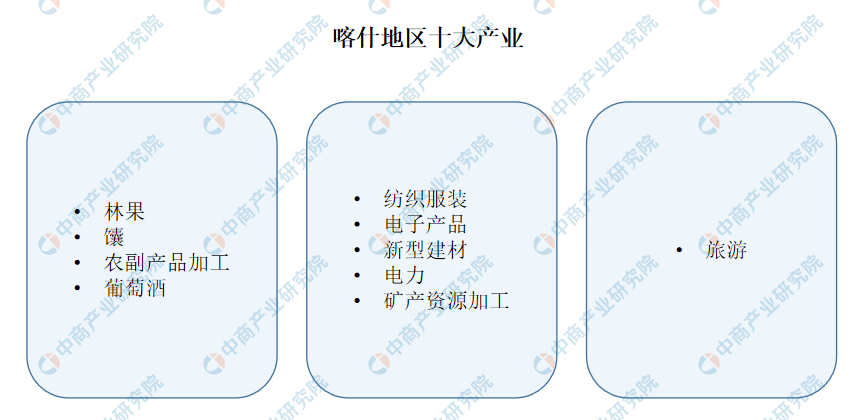 “十四五”期间,喀什地区做实做优做强实体经济,重点抓好林果、馕、农副产品加工、葡萄酒、纺织服装、电子产品、新型建材、电力、矿产资源加工、旅游等“十大产业”,加快构建具有喀什特色的现代产业体系。