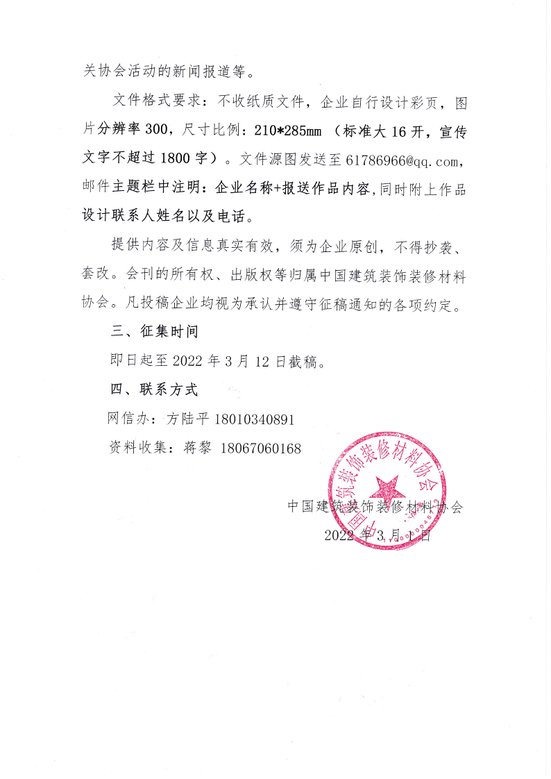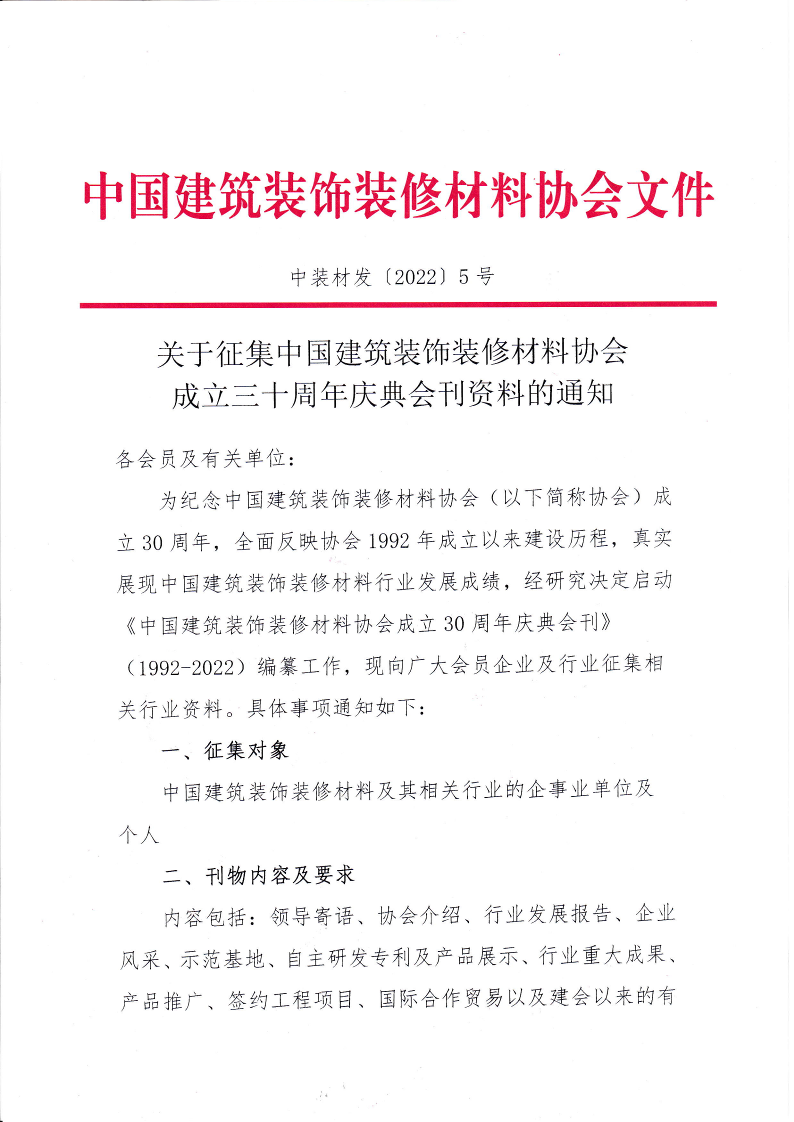 关于征集中国建筑装饰装修材料协会成立三十周年庆典会刊资料的通知