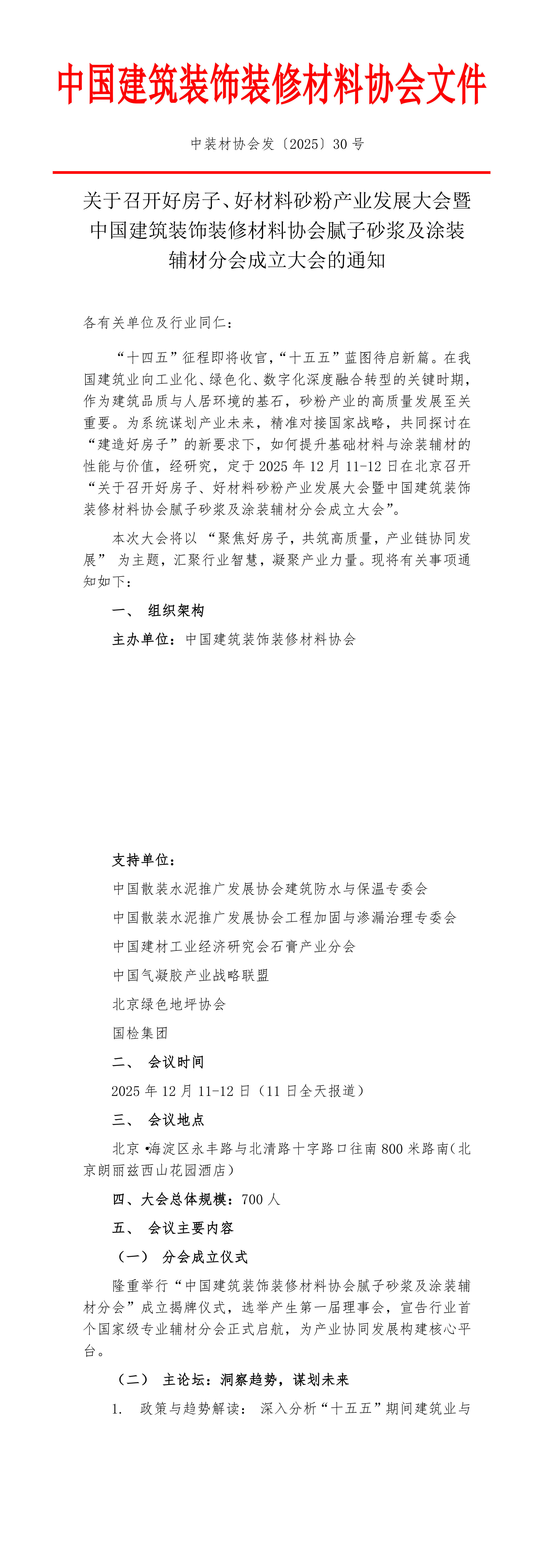 关于召开好房子、好材料砂粉产业发展大会暨中国建筑装饰装修材料协会腻子砂浆及涂装辅材分会成立大会的通知